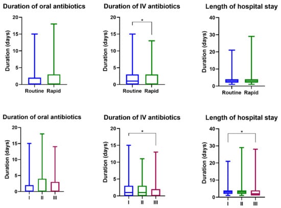The frequency of intravenous (IV) antibiotic use during period I using the routine test was 51.7%, and the rates of antibiotic use during periods II and III using FA-RP were 52.7% and 39.4%, respectively. In particular, the frequency of IV antibiotic use decreased significantly during period III (p = 0.002). There was no significant difference in the frequency of oral antibiotic use during the study period. There was no significant difference between the frequency and duration of IV antibiotic use between period I and period II. However, between period I and period III, the frequency of use of IV antibiotics, duration of use, and period of use of IV + oral antibiotics decreased significantly (Table 4, Figure 4). The duration of IV antibiotic use was significantly reduced in the FA-RP group when compared to the routine test group (p = 0.015). The length of hospital stay was significantly reduced in period III when compared to period I (p = 0.004).