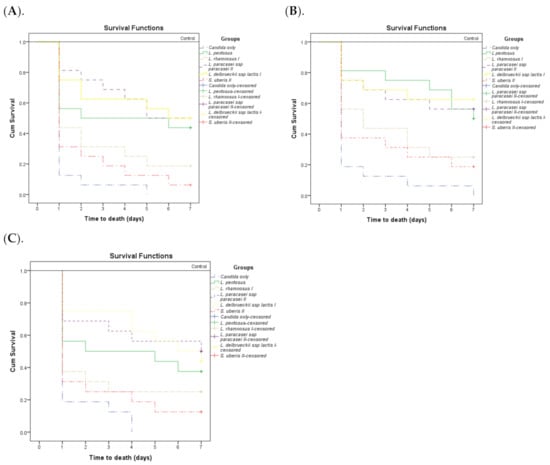 Conversely, larvae treated with Candida isolates plus BLISs of L. pentosus, L. delbrueckii subsp. lactis I, and L. paracasei subsp. paracasei II (50 μg/larva) exhibited significantly improved survival on the first, second, and seventh days in comparison to larvae inoculated with Candida isolates alone (p < 0.01) (Table 5). The effect of the BLIS from L. rhamnosus I on the survival of G. mellonella larvae infected with Candida isolates on the first, second, and seventh days was less significant. Finally, the effect of the BLIS from S. uberis II was not statistically significant as compared to Candida isolates alone (Table 5 and Figure 1).