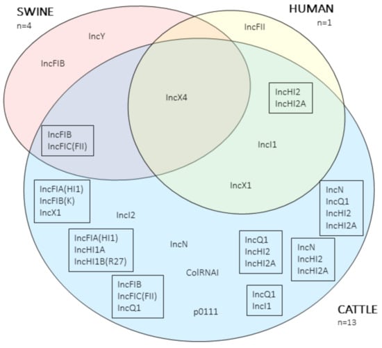 A total of 48 plasmids bearing antimicrobial resistance genes (ARGs) (including those encoding for mcr–1) were retrieved after sequencing and assembling: 36 plasmids from the bovine isolates (ranging from one to five per isolate), seven from porcine (from one to two per isolate), and five from the farmer’s isolate (Table S3). Several replicons were identified in these plasmids, some of them in the same mobile genetic element, and 19 different replicon combinations (Figure 2). The most prevalent replicon was IncX4 (n = 14), which harbored the mcr-1 gene and was present in isolates from the three hosts considered. Other common replicons were IncFIB (n = 9), IncHI2 / IncHI2A combination (n = 7), IncFIC (n = 6), and replicon combination IncFIB / IncFIC (n = 6).