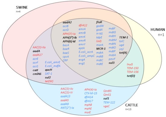A total number of 85 ARGs were identified using Abricate with CARD (Table S3), encoding resistance to different antibiotic classes; cephalosporins, beta-lactams, aminoglycosides, fluoroquinolones, lincosamides, macrolides, peptides, phenicols, sulfonamides, tetracyclines, and trimethoprims among others. All the isolates were classified as MDR genotypically. Furthermore, all 85 ARG were encountered in isolates of cattle origin, while 63 of them were found in pigs and 53 in the human isolate (Figure 3).
