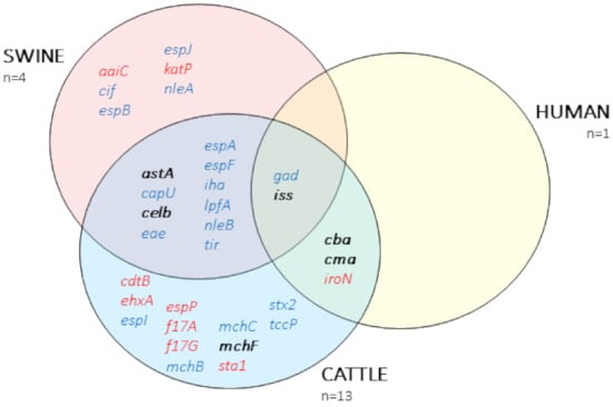 A total of 33 virulence factors were detected (Table S3). While nine genes were found exclusively in plasmids, 18 were located in the chromosome. The remaining six virulence genes were found in both locations, chromosome and plasmids. In general, E. coli from cattle origin contained the highest amount of virulence genes (27) (Figure 5), followed by swine (18) and the isolate from the farmer (5).