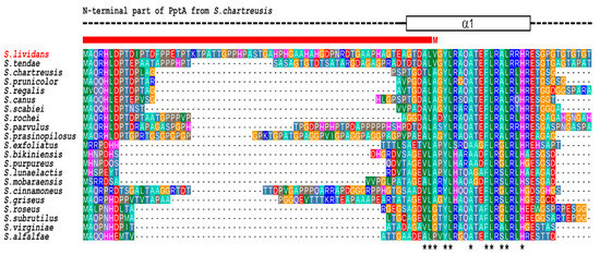 Multiple sequence alignment of the N-terminal region of PptA-like proteins from various Streptomyces. The crystal structure of S. chartreusis PptA (PDB entry 6RN5) is schematically shown above the alignment. Dashed line represent structurally disordered areas, whereas the rectangle in solid lines represent the N-terminal α-helix (α1). Asterisks under the alignment indicate strongly conserved hydrophobic residues expected to play key roles in the stability of the protein fold. The red bar above the alignment indicates the region that is missing in the current database entry for PptA (SLI_4383) of S. lividans (GenBank entry EFD67904.1) due to incorrect assignment of the translation start site (M).