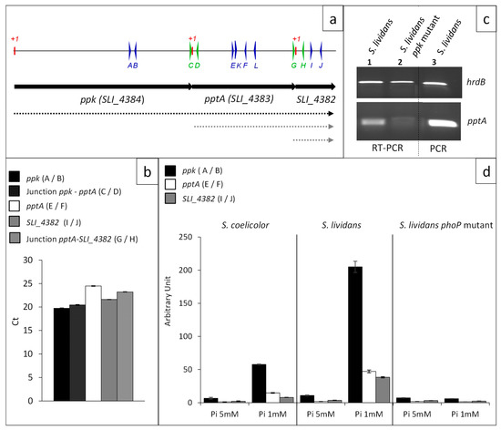 In order to establish the transcriptional situation of the genes ppk, pptA, and SLI_4382 that are located just upstream of the genes encoding the high affinity phosphate transporter (PstSCAB), RNA was prepared from S. lividans grown for 40 h on solid R2YE medium with no phosphate added (1 mM final, Pi limitation) and specific primers, internal to each gene or between two adjacent genes, were designed to assess their transcriptional organization by RT-qPCR (Figure 2a).