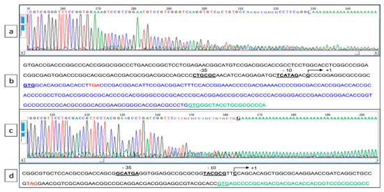 Determination of the transcriptional start point of SLI_4383/pptA and SLI_4382 established by 5′ RACE PCR. (a,c) Chromatograms of 5′ RACE PCR of the pptA and SLI_4382 promoter region, respectively. (b,d) Annotated sequence of the promoter region of pptA and SLI_4382, respectively. The bent arrow represents the transcriptional start site, putative −10 and −35 boxes are underlined, the translational start codons (GTG) are in bold letters and underlined, and the translational stop codon of ppk and SLI_4383 are in red. The erroneously annotated GTG start codon of PptA in the GenBank entry for the S. lividans genome (GG657756.1) is underlined.