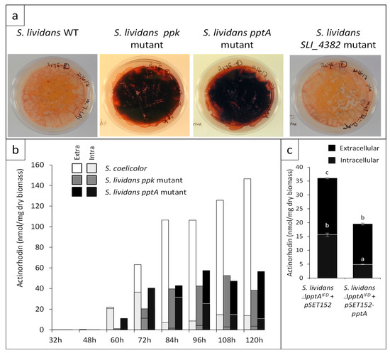 The strains S. lividans ppk::Ωhyg, S. lividans pptAIFD deletion mutant, and S. coelicolor M145 were grown for 72 h at 28 °C. Each strain was grown on four individual 9 mm diameter plates (Figure 4b) or on four 5 mm diameter plates (Figure 4c) of solid R2YE medium with no KH2PO4 added but containing 1 mM free K2HPO4 from elements of the media (condition of phosphate limitation). To quantify extracellular ACT, at different points throughout growth, the cellophane of the 9 mm diameter plates was lifted and a agar cylinder of the growth medium was taken aseptically from each of the four replicates using an appropriate device (Figure 4b) or the totality of the agar medium present just under the cellophane disk cellophane of each of the 4 replicates was cut into small pieces (Figure 4c). The 4 agar cylinders together (Figure 4b) or the agar pieces (Figure 4c) were allowed to diffuse in 2 mL of water for 2 h at 4 °C. The first eluate was transferred into a new tube. The operation was repeated twice and 3 mL of HCl (3 M) were added to the 6 mL of final eluate. The mixture was incubated on ice for one night to allow ACT precipitation. To quantify intracellular ACT at different time points throughout growth (Figure 4b) or after 72 h of cultivation (Figure 4c), mycelium present in an area of 1 cm2 of each replicate (Figure 4b) or the totally of the mycelium present under the cellophane disk (Figure 4c), was scraped off, lyophilized, and weighted. Collected mycelium samples were incubated in 1 mL of KOH (1 M) for 30 mn at 4 °C under agitation. After centrifugation, the supernatant was transferred into a new tube and this operation was repeated five times. Two mL of HCl (3 M) were added to the 4 mL of final eluate. The mixture was incubated on ice one night to allow ACT precipitation. After centrifugation at 13,000× g for 30 mn at 4 °C and elimination of the supernatant, the reddish pellet of precipitated ACT was re-suspended in 1 mL KOH (1 M). The optical density of the KOH solutions corresponding to extra- and intra-cellular ACT was determined at 640 nm in a Shimadzu UV-1800 spectrophotometer using KOH (1 M) as blank. The Beer–Lambert law (molar attenuation coefficient of ACT = 25,320) was used to calculate the amount of ACT produced expressed in nano moles per mg of dry biomass [43]. For Figure 4c, the results obtained are presented as the mean ± standard error; a p-value < 0.05 was considered as statistically significant. The letters above the histograms indicate the significance of the differences. When two histograms bear two different letters that means that they are statistically significantly different (p > 0.05; Tukey adjusted comparisons). For Figure 4b, the standard error could not be presented since the 4 agar plugs, as the four mycelial samples, were incubated in the same tube.
