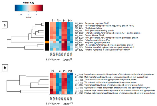 Heatmap representation of proteins of the Pho regulon involved in phosphate scavenging and up-take (a) as well as in the biosynthesis of phosphate free teichulosonic acid biosynthesis in replacement of teichoic acids (b) with significant abundance change (ANOVA, adjusted p value < 0.05) between S. lividans (TK24) and its SLI_4383/pptA deletion mutant. The strains were grown at 28 °C for 48 and 60 h on solid R2YE medium containing glucose (50 mM) as main carbon source and 5 mM (Pi+) or 1 mM (Pi-) phosphate (conditions of phosphate proficiency or limitation, respectively). Protein identifiers are indicated as SLI numbers for both strains and by predicted functions.