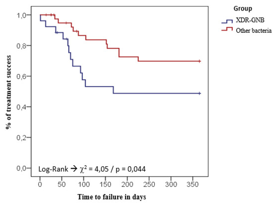 Kaplan–Meier survival curve for treatment failure (death/recurrence) considering PJIs caused by XDR-GNB and other bacteria.