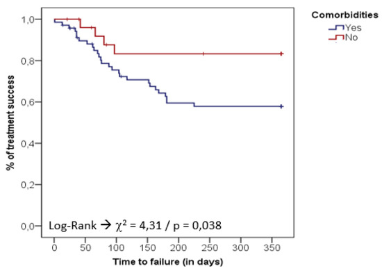 However, according to the multivariate model, infections caused by XDR-GNB (PR: 2.3; 95% CI: 1.0–5.2; p = 0.044) and the presence of comorbidities (PR: 2.9; 95% CI: 1.0–8.4; p = 0.044) were strong predictive RFs independently associated with therapeutic failure (Table A3). The higher rates of treatment failure associated with XDR-GNB PJI and patients with comorbidities is best illustrated in Figure 1 and Figure 2.