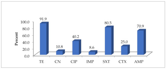 Overall, the highest resistance was detected in tetracycline (91.9%), followed by trimethoprim-sulfamethoxazole (80.5%), ampicillin (70.9%), ciprofloxacin (40.2%), cefotaxime (22.5%), 10.8% gentamycin (10.8%) and imipenem (3.3%) (Figure 1).