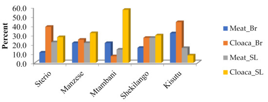 As shown in Figure 2, the isolation of MDR E. coli was higher in cloaca than chicken meat in both types of chicken.