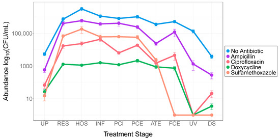 Abundance of microbial colonies grown on the four antibiotics and a control at each stage of the treatment process. Total heterotrophic and resistant microbial concentrations saw significant reductions from the initial raw sewage to the final UV-treated effluent. Error bars indicate the standard error of the mean for each antibiotic treatment at each site. UP, upstream; RES, residential sewage; HOS, hospital sewage; INF, sewage influent; PCI, primary clarification influent; PCE, primary clarification effluent; ATE, aeration tank effluent; FCE, final clarification effluent; UV, UV treated effluent; DS, downstream.