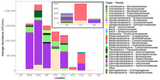 CFU/mL normalized counts of 16S rRNA gene relative abundance data for antibiotic-resistant communities at each sampling location. Combined Mallard and Sugar Creek samples at each sampling location including combined antibiotic-amended cultured communities. Relative abundance determined through 16S rRNA gene sequencing was multiplied by CFU/mL at each location to determine estimated taxonomic abundances. The inset shows the enlarged taxonomic abundances for the upstream, UV-treated, and downstream locations. Families making up <1% of the total community at each site were excluded. UP, upstream; RES, residential sewage; HOS, hospital sewage; INF, sewage influent; PCI, primary clarification influent; PCE, primary clarification effluent; ATE, aeration tank effluent; FCE, final clarification effluent; UV, UV treated effluent; DS, downstream.