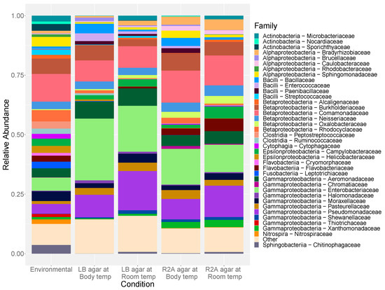Between the two incubation temperatures, Arcobacter sp. (Campylobacteraceae; p = 0.001) and Pseudomonas sp. (Pseudomonadaceae; p < 0.001) were seen in greater abundance at room temperature (Figure 6). Members of the Bacillaceae family, particularly Bacillus sp., made up greater proportions of the cultured communities at 37 °C (p = 0.024; Supplementary Table S10). Corresponding to significant changes in diversity between the two media sources, several taxonomic families were found to be significantly more abundant on R2A agar. These families include individuals within each of the four proteobacterial classes recovered, such as Bosea sp. (p = 0.004), Polynucleobacter sp. (p = 0.024) Arcobacter sp. (p = 0.001), and Stenotrophomonas sp. (p = 0.025). Only antibiotic-resistant Enterobacteriaceae were found to be significantly more abundant on the LB agar (p = 0.013).