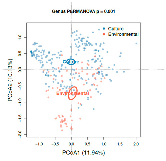 The principal coordinate analysis (PCoA) plot generated using Bray–Curtis dissimilarity distances showed that the 76 environmental samples were clustered apart from the 227 cultivated samples at the genus level (Figure 7). Alpha diversity of the cultured communities was significantly lower than that found in the communities of the culture-independent approach (p < 0.001; Figure 5). Of the 731 OTUs found in both datasets, these culturable OTUs represented an average of 13.4% of the environmental source communities across all samples (Figure 8a), while the remaining 118 OTUs unique to environmental samples made up the rest of the community. Some environmental samples were made up of culturable OTUs amounting to as high as 75% of that sample’s community.