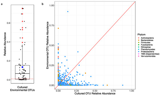 (a) Boxplot representing the relative abundance of OTUs also found among the culturable communities from each environmental sample. Outliers are indicated by “*” and the mean relative abundance for all samples is indicated by “♦” where the average abundance was 13.4%. (b) Relative abundances each culturable OTU between environmental and cultured communities. Each OTU is assigned a color based on the phyla that OTU was assigned to. The red line is the identity line representing equal abundance between sequencing approaches (Environmental = Cultured).