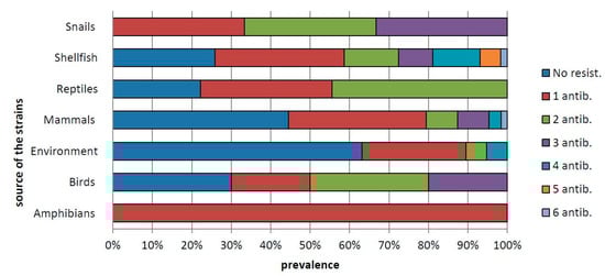 Percentage of Salmonella strains resistant to one or more (up to six) antibiotics in isolates from amphibians (frogs), birds, environment, mammals, shellfish, reptiles and snails.