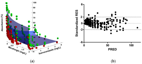 Goodness-of-fit plots of the Greco model for the combination of isavuconazole and micafungin against C. auris CJ100. (a) The blue surface represents model predictions, the green spheres represent observations above the fitted surface, and the red squares represent observations below the fitted surface. (b) Standardized residuals (Standardized RES) versus predictions (PRED).