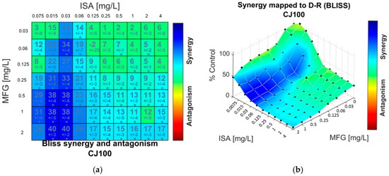 Synergy distribution determined by Bliss interaction model for the combination of isavuconazole (ISA) and micafungin (MFG) against C. auris CJ100. (a) Matrix synergy plot with synergy scores for each combination. (b) Synergy distribution mapped to dose–response surface.