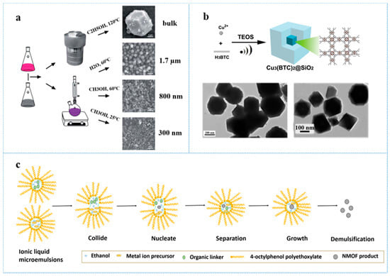 (a) Schematic illustration of synthesis of ZIF-67 with various sizes by solvothermal methods. Scale bars = 3 μm; reprinted with modifications from Xia et al. [28]; (b) schematic representation of the synthesis of the Cu3(BTC)2@SiO2 core–shell nanocrystals using ultrasonic method and the TEM images of as-synthesized Cu3(BTC)2@SiO2; reprinted with modifications from Li et al. [32]; (c) schematic illustration of the growth mechanism of HKUST-1 nanoparticles prepared in an ionic liquid-containing microemulsion system, adapted from Zheng et al. [33].