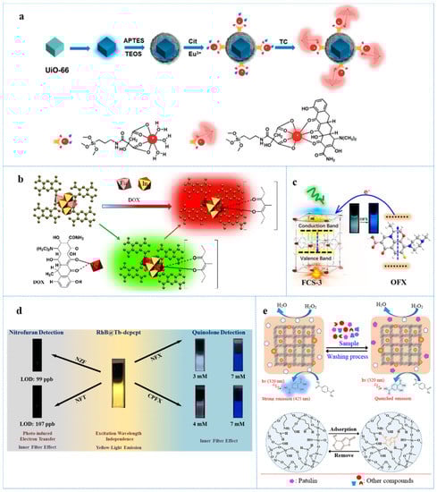 (a) Schematic diagram for the fabrication procedure of a Dye@UiO-66-@SiO2-Cit-Eu nano-probe and the sensing process for tetracycline (TC). Reprinted with modifications from Jia et al. [39]; (b) schematic illustration showing the recognition of DOX based on the fluorescent sensor Eu-In-BTEC, reprinted with modifications from Yu et al. [43]; (c) fabrication and engineering of anionic metal–organic framework as a unique turn-on fluorescent chemical sensor for ultra-sensitive detection of antibiotics, reprinted with modifications from Li et al. [44]; (d) The image of RhB@Tb-dcpcpt for sensitive and selective detection toward antibiotics in water, reprinted with modifications from Yu et al. [48]; (e) Schematic image for selective determination of patulin based on MIP-capped AgNPs@ZnMOF and closer look on the location of patulin in MIP sites and its interaction with specific functional groups. Reprinted with modifications from Nafiseh Bagheri et al. [50].