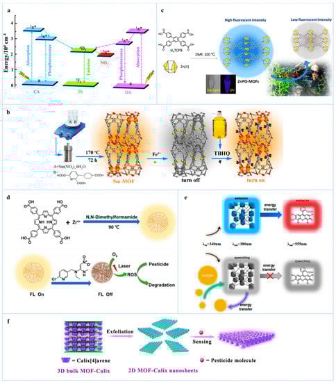 Pesticides play an essential role in the agricultural field to secure the quantity and quality of products [62]. However, many pesticides are hard to degrade in the human body and may lead to different kinds of diseases and even cancer. Thus, effective detection of pesticides makes a lot of sense. Using NMOF as fluorescence sensor for on-site sensing pesticides can overcome practical limitations of conventional methods like chromatographic techniques, which require professional operators, instruments, and so on [63]. Many research groups have applied NMOF sensors to effectively determine pesticides in water medium and real food samples. To date, the usual sensing mechanism of NMOFs-based fluorescence sensors for organic pesticides determination is the pesticides-induced quenching effect. Meanwhile, novel detecting methods and mechanisms are explored.