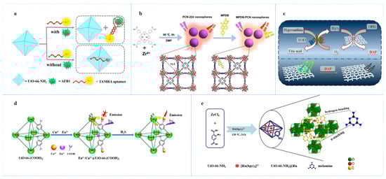 (a) Schematic illustration of the fluorescent aptasensor for AFB1 detection base on UiO-66-NH2, reprinted with modifications from Jia et al. [76]; (b) schematic representation of solvothermal synthesis of PCN-224 nanospheres and post-synthetic modification fabrication process of MPDB-PCN nanospheres, reprinted with modifications from Guo et al. [77]; (c) schematic illustration for the principle of the biosensor based on NH2-Cu-MOF nanosheet, reprinted with modifications from Hu et al. [80]; (d) schematic illustration of the fluorescence detection mechanism based on Eu3+/Cu2+@UiO-66-(COOH)2, reprinted with modifications from Zhang et al. [82]; (e) schematic illustration of the preparation process and the ratiometric fluorescence detection of melamine based on UiO-66-NH2@Ru Probe, reprinted with modifications from Lin et al. [89].