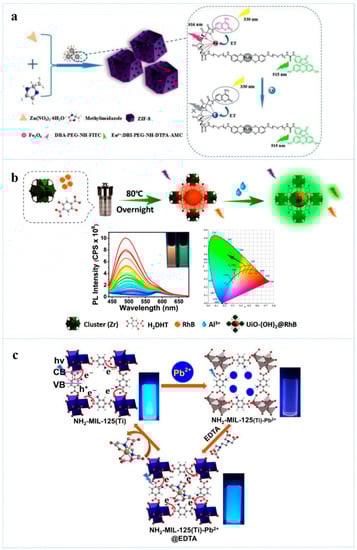 (a) Schematic illustration of the process for encapsulating the lanthanide complex modified Fe3O4 into ZIF-8 and concept for sensing Cu2+, reprinted with modifications from Wang et al. [99]; (b) schematic illustration of the fabrication of UiO-(OH)2@RhB and the sensing process to Al3+, reprinted with modifications from Zheng et al. [110]; (c) schematic of the fluorescence quenching and recovery mechanisms of NH2-MIL-125, reprinted with modifications from Venkateswarlu et al. [113].