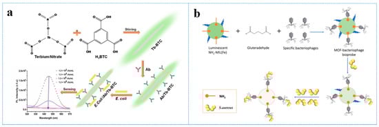 (a) Schematic diagram for the application of Ab/Tb-BTC for detecting E. coli, reprinted with modifications from Gupta et al. [123]; (b) schematic diagram for the application of NH2-MIL-53 (Fe) for sensing S. aureus, adapted from Bhardwaj et al. [124].