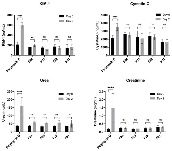 Figure 1. Biomarker response in rats before (day 0) and after treatment (day 2) with novel formulations VRP034_F21–24 and polymyxin B (control). Note: (i) In the polymyxin B (control) group, one animal died after the 7th dose and the other two died after the 8th dose. The results shown are for animals who survived treatment; n = 3. (ii) In all other treatment groups, no mortality was observed, and the results are shown for all animals; n = 6. (iii) p-values are presented for increase in biomarkers on day 2 vs. day 0; nonsignificant (ns); p < 0.01 (**); p < 0.0001 (****).