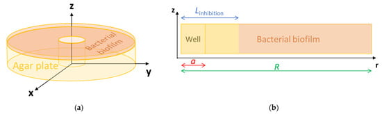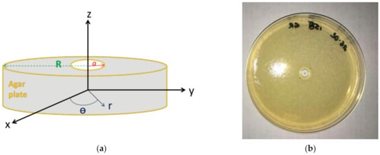 - a (m) is the radius of the well made in the agar plate center (Figure 1) and CAg0+ (mol m−3) the initial concentration of the Ag+ solution that was deposited in the well