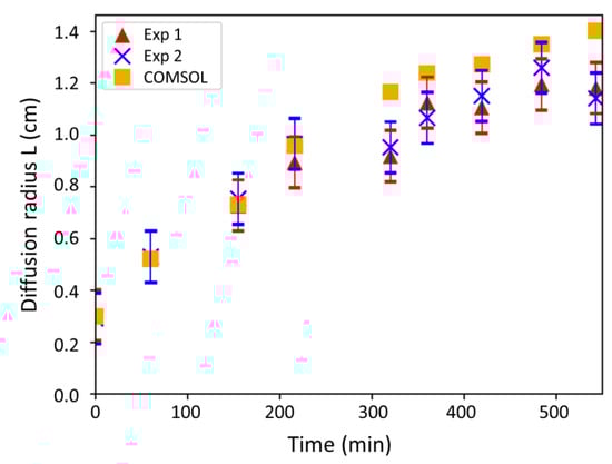 The comparison between the model and experiments is intended to determine the DAg+ value, which appears in Equation (3), i.e., the diffusivity of silver ions in Lysogeny Broth (LB) agar (at 15 gagar L−1 and 37 °C). The radii (L) of the diffusion halos measured experimentally and obtained by the model were reported against time in Figure 2. For the model, a similar silver concentration as in the experiments was used (i.e., 100 mg L−1) and the silver diffusivity DAg+ in the agar was fixed to 2.7 × 10−9 m2 s−1 in order to fit the model with the experiment.