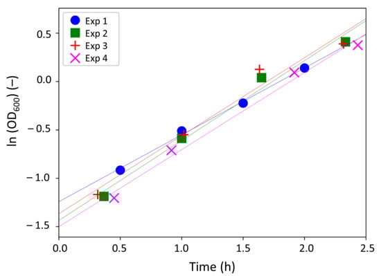 As predicted by the model, the evolution of ln (OD600) is linear with time, with regression coefficients R2 ranging from 0.9684 to 0.9961 (Figure 3 and Table 2) and consistent OD600i values. The experimental data were thus used to determine the maximal growth rate µmax.