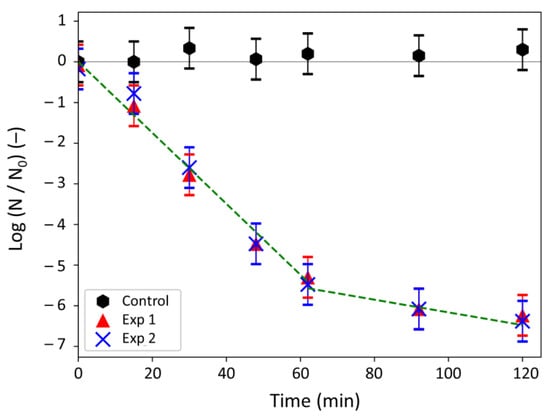 The goal of the experiments was to determine the kinetics of the silver ions antibacterial action in a continuous stirred tank reactor whose liquid medium was exempt of nutriments. In this configuration, bacterial growth was avoided and the constant agitation allowed the contact between Ag+ ions and bacteria by convection movements of the liquid. The mass transfer of silver toward bacteria was thus expected to be not limiting, which, thus, should induce a limitation by the biocidal phenomenon. Due to the high antibacterial efficiency of Ag+ ions [], a small concentration of silver (i.e., 3.0 mg L−1) was chosen for the experiments to permit (i) the monitoring of the bacterial concentration decrease over time, and (ii) the further use of the models presented in Section 2.3.1. The bacterial concentration N was measured over time (Table 3) and the log-removal values were plotted against time in Figure 4.