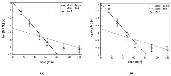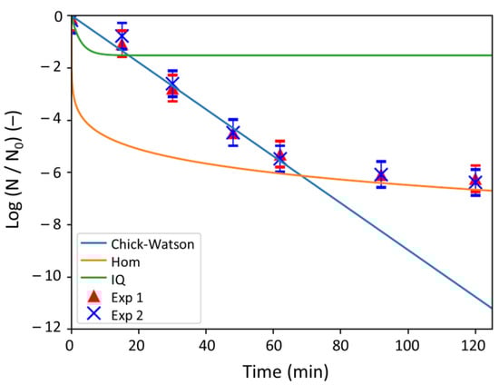 Figure 4 evidences that the log-removal decreased quickly over the first 62 min and that the values were proportional to time (R2 = 0.9815). Then, the variations of the log-removal values with time became less significant but still adopted a linear behavior (R2 = 0.9713). A comparison between the experiments and the different models is presented in the next section.