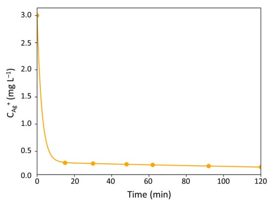 Table 3 and Figure 4 put in evidence a clear action of the silver ions against bacteria. Indeed, the bacterial concentration remained quasi-constant in the control reactor (i.e., 1.1 ± 0.4 × 109 CFU mL−1 on average), whereas it was reduced by 6 log (i.e., by 99.9999%) after 120 min when Ag+ ions were present.