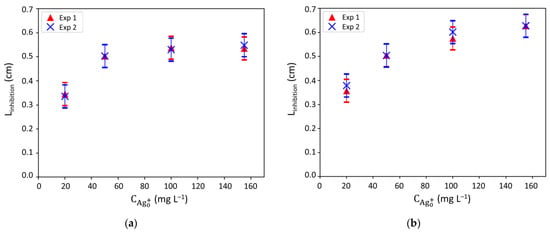 Inhibition halos radii (Linhibition) measured after 24 h of contact with silver ions (Ag+) on: (a) LB agar and (b) agar with similar composition of LB except that NaCl was removed; different initial concentrations of Ag+ were tested and each condition was replicated (Experiment 1 and Experiment 2, named Exp 1 and Exp 2, respectively).