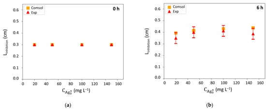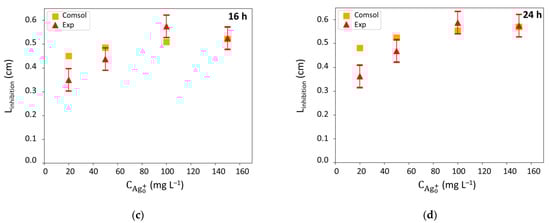 Inhibition halos radii (Linhibition): comparison between experimental (Exp) and model (Comsol) results at (a) 0 h, (b) 6 h, (c) 16 h, and (d) 24 h.