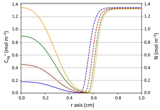 The COMSOL simulation gave access to the concentration profiles for Ag+ (CAg+) and E. coli (N) in the biofilm formed on the agar. These profiles are available over time and over space (along r axis). An overview of these spatial distributions after 24 h of contact is given in Figure 11.