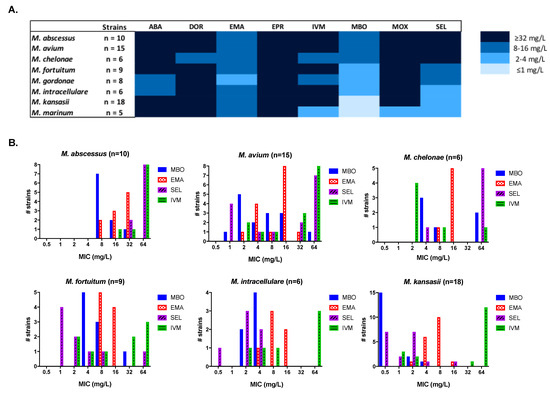 In vitro susceptibility of nontuberculosis mycobacteria (NTM) against different avermectins and milbemycins. (A) Heat map representation of the most common MIC values of eight ML against a panel of NTM strains. (B) MIC distribution of the most active ML against clinically relevant NTM strains. ABA, abamectin; DOR, doramectin; EMA, emamectin; EPR, eprinomectin; IVM, ivermectin; MBO, milbemycin oxime; MOX, moxidectin; SEL, selamectin.