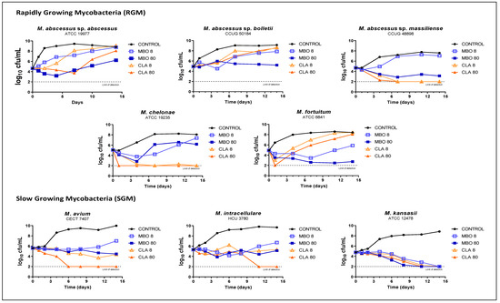 In vitro Time Kill Assays of milbemycin oxime against different RGM and SGM species. Clarithromycin was also included as internal control of activity. Compounds were tested at 8 mg/L and 80 mg/L, i.e., 1×MIC and 10×MIC of milbemycin oxime, respectively. MBO, milbemycin oxime; CLA, clarithromycin.