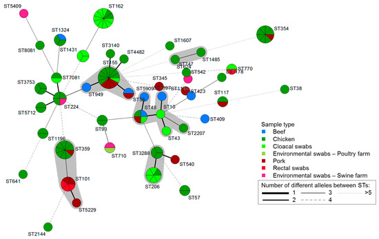 Minimum spanning tree based on multilocus sequence typing alleles of 115 QRDR/PMQR-harboring E. coli isolates from beef, chicken, pork, cloacal swabs, rectal swabs, and environmental swabs. Each circle corresponds to an individual sequence type (ST), and the circle size indicates the number of isolates assigned to the same ST. The color of the circle denotes the sample type. The connecting lines (solid and dashed) between circles denote allelic variations between STs, and the gray shadowing indicates STs belonging to the same clonal complex (CC).
