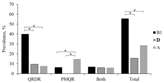 The majority of the isolates were assigned to phylogenetic group B1 (55.7%) (p < 0.05), followed by group A (28.7%) and group D (15.7%). None of the isolates belonged to phylogenetic group B2 (Figure 1). While isolates with amino-acid substitutions in QRDRs were significantly associated with phylogenetic group B1 (p < 0.05), isolates harboring PMQR genes were significantly associated with phylogenetic group A (p < 0.05). In contrast, isolates that harbored both QRDR and PMQR genes were distributed evenly among phylogenetic groups (A, B1, and D) (Figure 3).