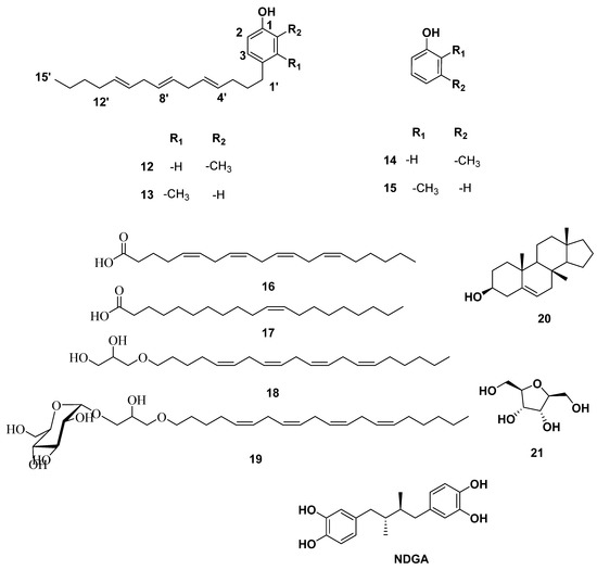 Based on the physicochemical and chromatographic properties, the spectral analyses from UV, 1H, and DEPT-Q NMR, as well as comparisons with the literature and some authentic samples, the crude alcoholic extract of S. cinereum afforded the new aryl cresol 12–13, along with the known O-cresol 14 [20], m-cresol 15 [21]. Additionally, arachidonic acid 16 [22], eicosenoic acid 17 [22], 1-O-arachidonyl-glycerol 18 [23], 1-O-arachidonyl-3-O-(α-d-glucopyranosyl) glycerol 19 [23], 7-β-methyl androstenol 20 [24], and 1-deoxy-β-d-psicosofuranose 21 [25], were identified (Figure 2). All characterized compounds 14 and 15 were isolated herein for the first time from the genus Sargassum (Figure 2, Figures S3–S28).