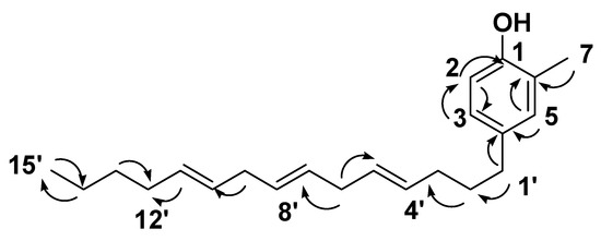 NMR data also showed eight aliphatic methylene groups at δH 1.20–2.8 δC 20.5–33.7 (Table 1), three olefinic methine groups at δH 5.31–5.35 (6H, m) δC 127.9–129.4. These signals are suggestive characteristics for 4,7,11-pentadecenyl moiety, where the heteronuclear multiple-bond correlation (HMBC) experiment of 12 (Figure 3) confirmed the position of the three olefinic methine groups at 4,7,11 of the alkene side-chain. Moreover, the HMBC experiment showed the 3 J-HMBC correlation of the proton H-1′ δH 2.26 (δC 33.4) with the quaternary carbonyl carbon C-4′ (δC 134.5). Accordingly, compound 12 was identified as 4-(1-(4,7,11-pentadecenyl)-o-cresol.