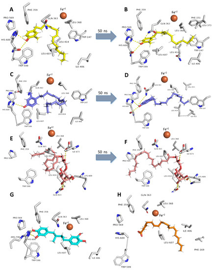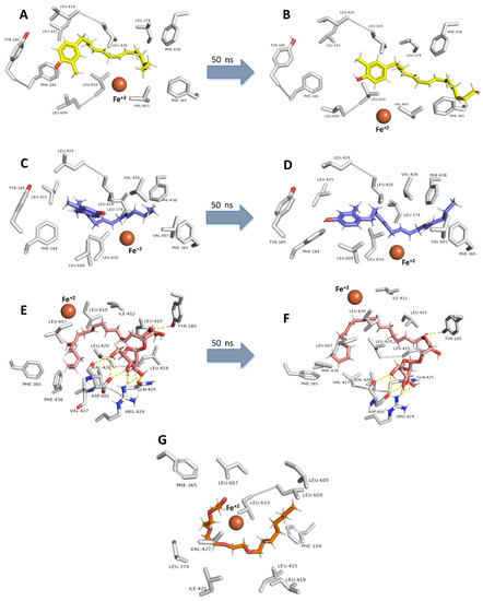 Binding modes of compounds 12, 13, and 19 inside 15-LOX’s active site. (A,C,E) Their binding modes upon docking. (B,D,F) Their binding modes over 50 ns MDS. (G) Binding mode of the co-crystalized ligands AA.