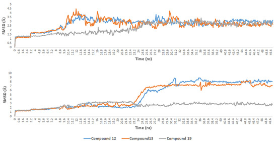 RMSDs of compounds 12, 13 and 19 inside 5-LOX and 15-LOX’s active sites over 50 ns of molecular dynamic simulations (MDS).