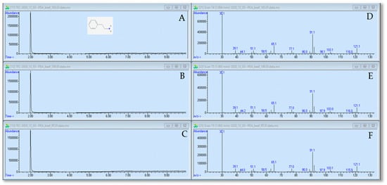 GC chromatograms of PEA and MS spectra of the 2 min peaks. Panel (A–C), chromatograms for PEA unheated (Panel (A)), PEA heated to 73.9 °C (Panel (B)), and PEA heated to 93.3 °C (Panel (C)). The x-axis is retention time in min. Panels (D–F), spectra of the 2 min peaks from the respective GC. The x-axis is m/z, where m is the mass and z is the charge. The PEA molecule integrated in Panel A was taken from PubChem (https://pubchem.ncbi.nlm.nih.gov/compound/).