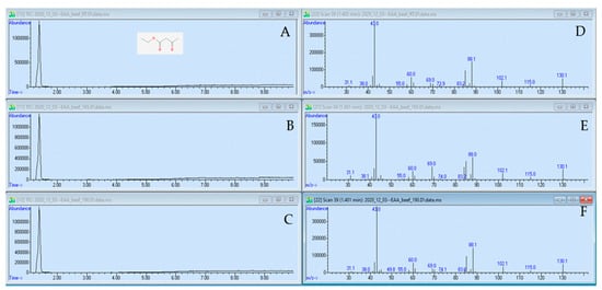Chromatograms of EAA and spectra of the 1 min peaks. Panel A to C, chromatograms for EAA unheated (Panel (A)), EAA heated to 73.9 °C (Panel (B)), and EAA heated to 93.3 °C (Panel (C)). The x-axis is retention time in min. Panels (D–F), spectra of the 1 min peaks from the respective GC. The x-axis is m/z. The EAA molecule integrated in Panel (A) was taken from PubChem (https://pubchem.ncbi.nlm.nih.gov/compound/).