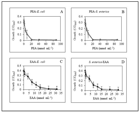 Growth of E. coli was determined as OD600 and declined with increasing concentrations of PEA-HCl (Figure 3A). For unheated, 73.9 °C heated, and 93.3 °C heated PEA-HCl, the MIC was 20.75 mmol mL−1. The growth pattern for S. enterica was similar (Figure 3B). The MICs for unheated, 73.9 °C heated, and 93.3 °C heated PEA-HCl were also 20.75 mmol mL−1. EAA prevented growth at a similar range of concentrations. We consider 23.4 mmol mL−1 the MIC for EAA to reduce the growth of E. coli. For the growth of S. enterica, the MIC for EAA was lower, at 15.6 mmol mL−1.