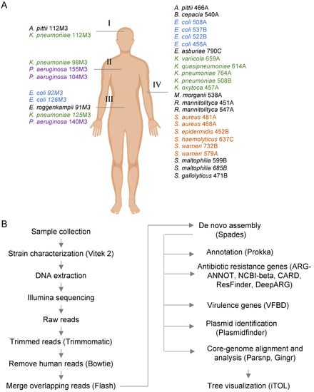 Overall strategy used for the whole-genome analysis of clinical strains. (A) In total, 34 bacterial strains were isolated from several samples, such as cerebrospinal fluid (I, 2 strains), bronchoalveolar lavage (II, 3 strains), ascitic fluid (III, 5 strains), and blood (IV, 25 strains). The four most common bacterial groups (Klebsiella pneumoniae, Escherichia coli, Pseudomonas aeruginosa, and Staphylococcus spp.) are colored. (B) Schematic representation of the main bioinformatic pipeline used for genome sequencing, assembly, annotation, and identification of antibiotic resistance genes (ARGs) and virulence factor and genomic analysis.